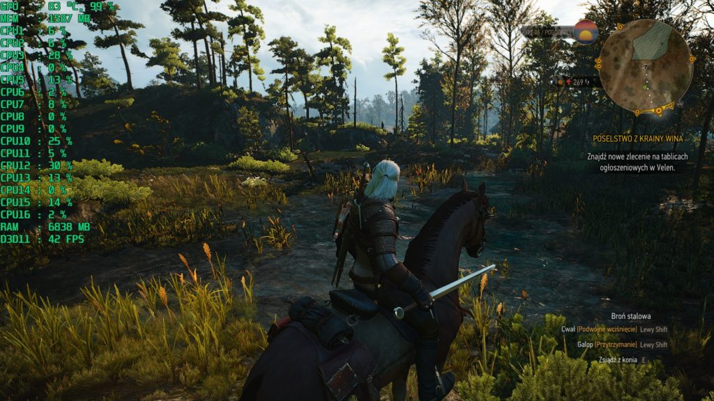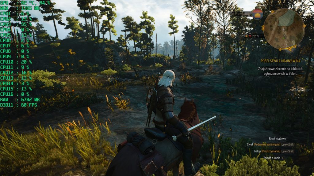 Aby można było zauważyć (dość subtelne niekiedy) różnice pomiędzy ustawieniami w Wiedźminie, przedstawiamy 3 screeny tego samego ujęcia. Stabilne 60 fpsów uzyskaliśmy przy ustawieniu postprocesów graficznych na wysokim (tzn. maksymalnym) poziomie, a samą grafikę potraktowaliśmy ustawieniami średnimi. Ustawiając grafikę na wysoką, gra zyskuje na pięknie, ale traci na klatkach (50-60fps), choć według mnie jest to idealna opcja grania z podzespołami Legion Y720T. Z kolei podnosząc grafikę do ustawień ultra, skończyło się to spadkiem do uśrednionych 45 fpsów, jednak następowały momenty, gdy wyświetlały się nawet poniżej 34. Ustawienia wysokie w menu postprocesów i grafiki jest więc najlepszym kompromisem. Oto parametry podzespołów towarzyszące 60 fpsom:
