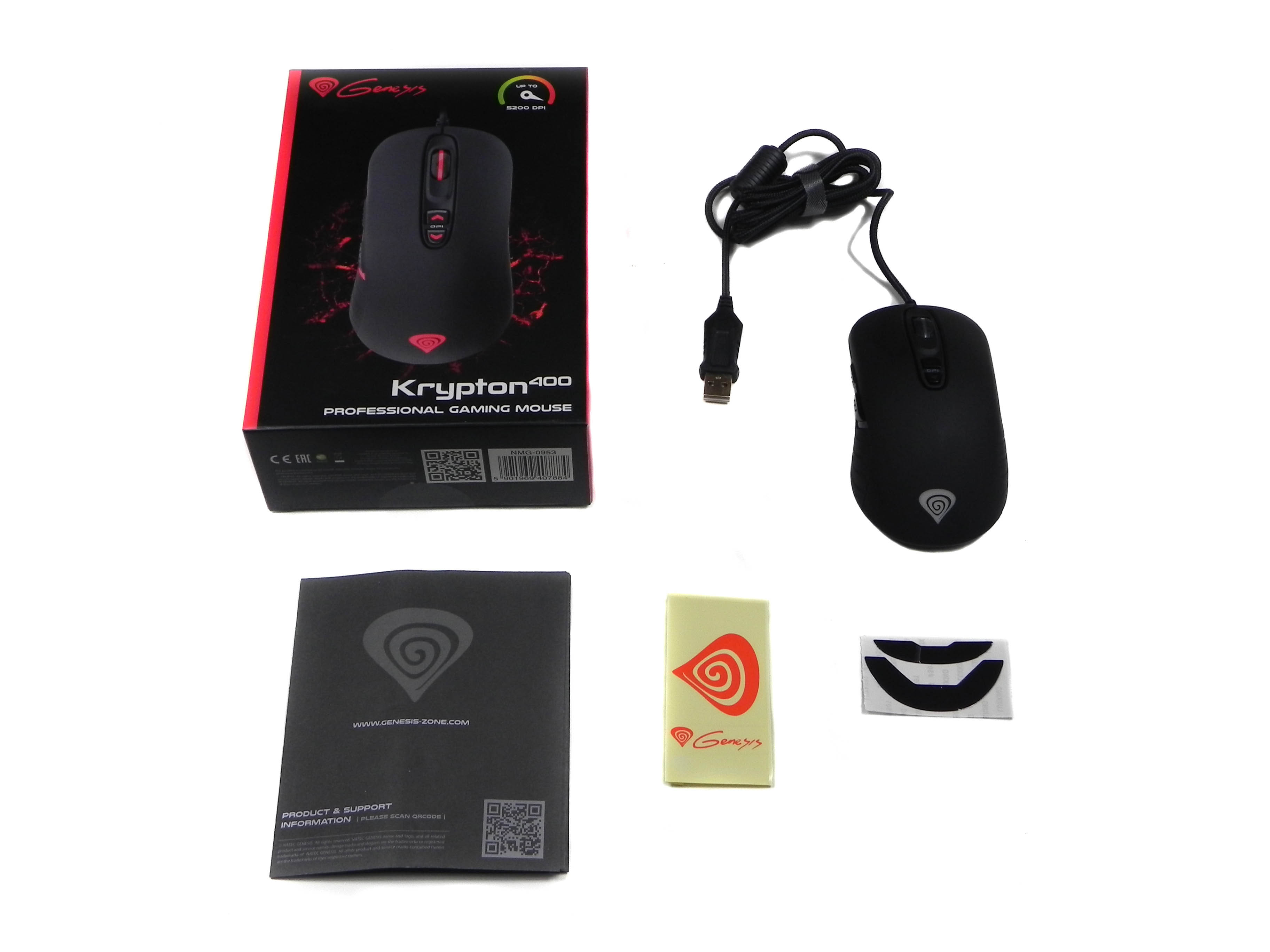 Czarno-czerwone pudełko z motywem popękanej magmy na froncie szybko informuje nas, że mamy do czynienia z ofertą rodzimego producenta. Genesis Krypton 400, widniejący na tle tej charakterystycznej grafiki, prezentuje się całkiem solidnie i aż zachęca, by zajrzeć do wnętrza opakowania. Przed tą czynnością warto zwrócić uwagę, że w tym samym miejscu oprócz myszki, widnieje informacja o rozdzielczości gryzonia dochodzącej do 5200 DPI. Liczba ta nie powali na kolana entuzjastów szalonych rozgrywek na 60 calowych ekranach, spokojnie jednak zaspokoi potrzeby reszty graczy.
