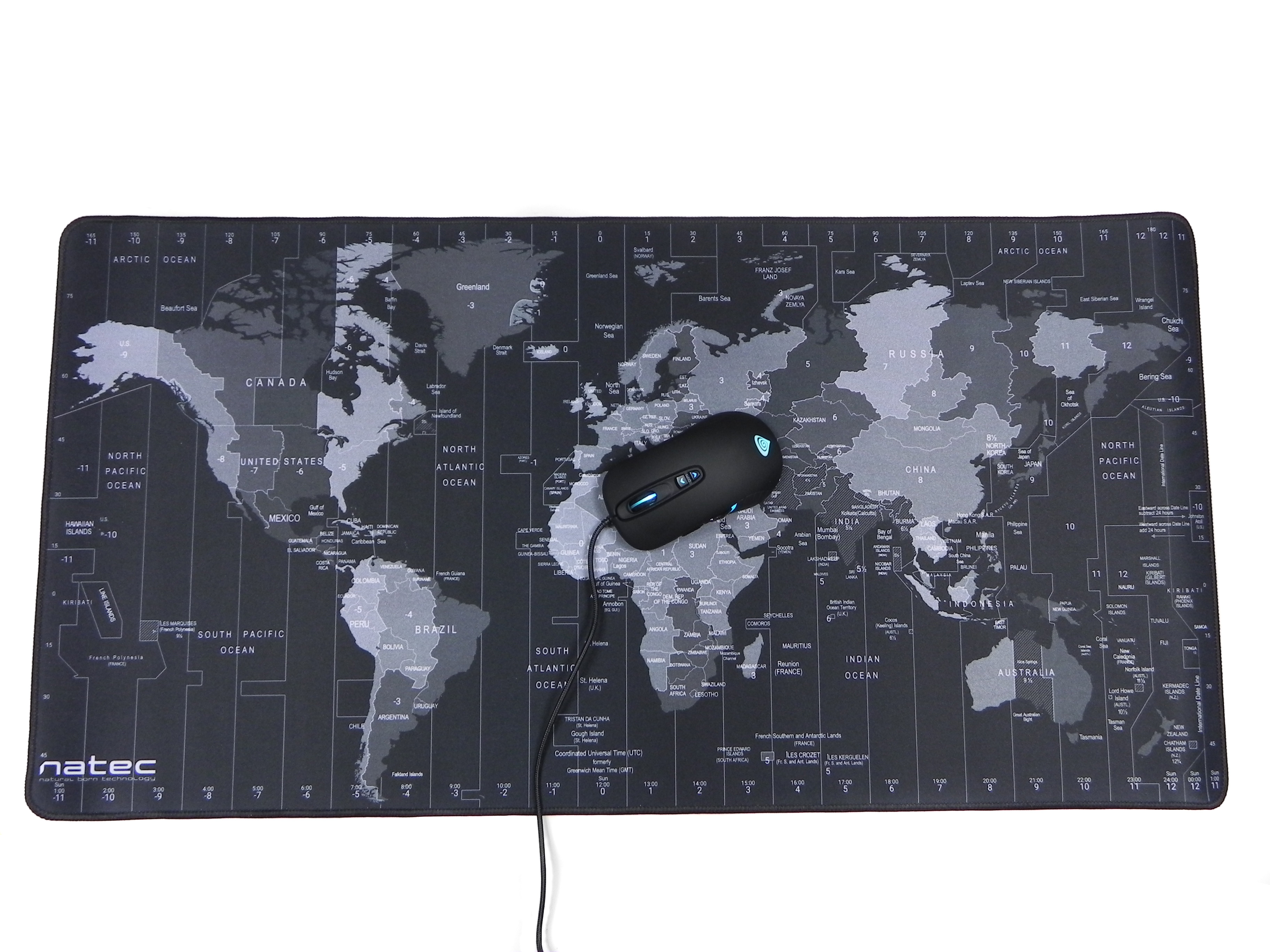 Dopełnieniem testu Genesis Krypton 400 jest podkładka Natec Time Zone Map – gigant, który mieści w sobie… cały świat! Mająca wymiary 800x400x3 mm mata posiada bowiem mapę Ziemi z uwzględnieniem południków i stref czasowych. Wzór ten jest na tyle uniwersalny, że prawdopodobnie będzie pasował do każdego biurka, choć rozmiary samej podkładki już nie. Mimo gabarytów Time Zone Map po prostu przykuwa oko dużym odwzorowaniem szczegółów. Przy początkowym testowaniu Kryptona 400 na kilka dłuższych chwil odpuściłem granie na rzecz studiowania tej mapy.