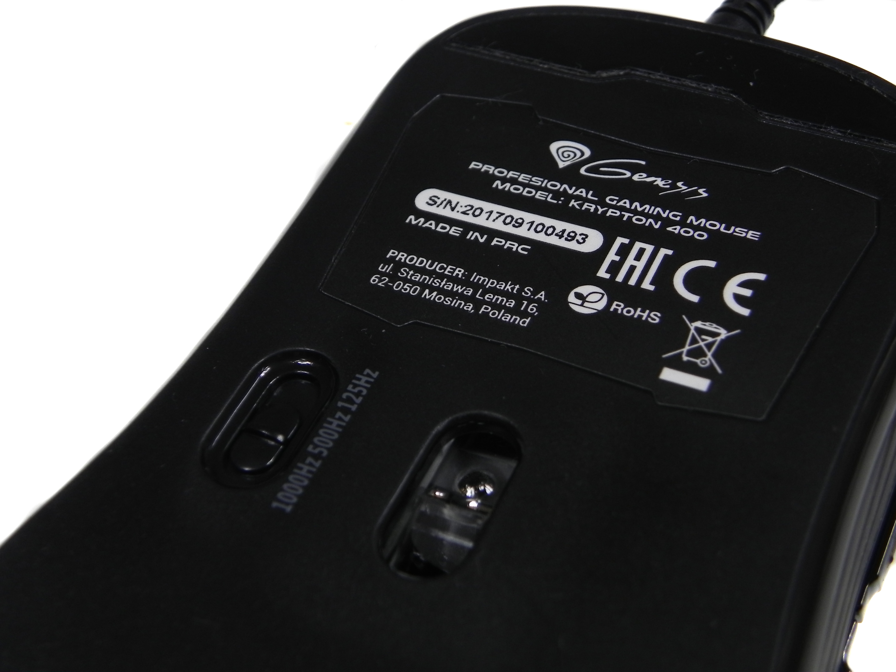 Przewracając gryzonia na drugą stronę widzimy dwa teflonowe ślizgacze u góry i na dole, naklejkę producenta, sensor PMW3320 generujący rozdzielczość rzędu 5200 DPI oraz przełącznik częstotliwości raportowania myszy, gdzie możemy ustawić 1000HZ, 500HZ i 125HZ. To z pewnością wygodna opcja, pozwalająca oszczędzić czas przy ustawieniach w oprogramowaniu gryzonia.