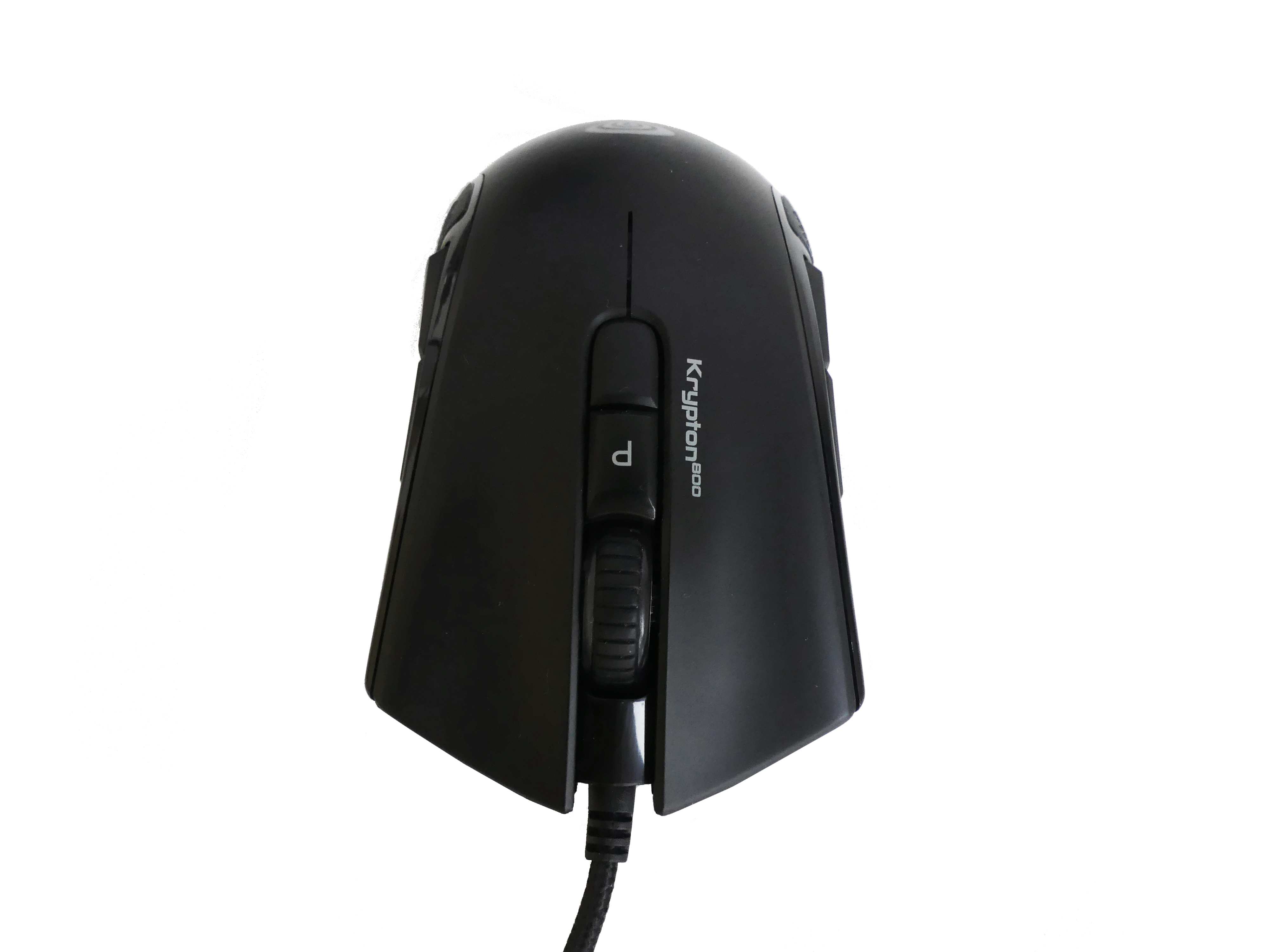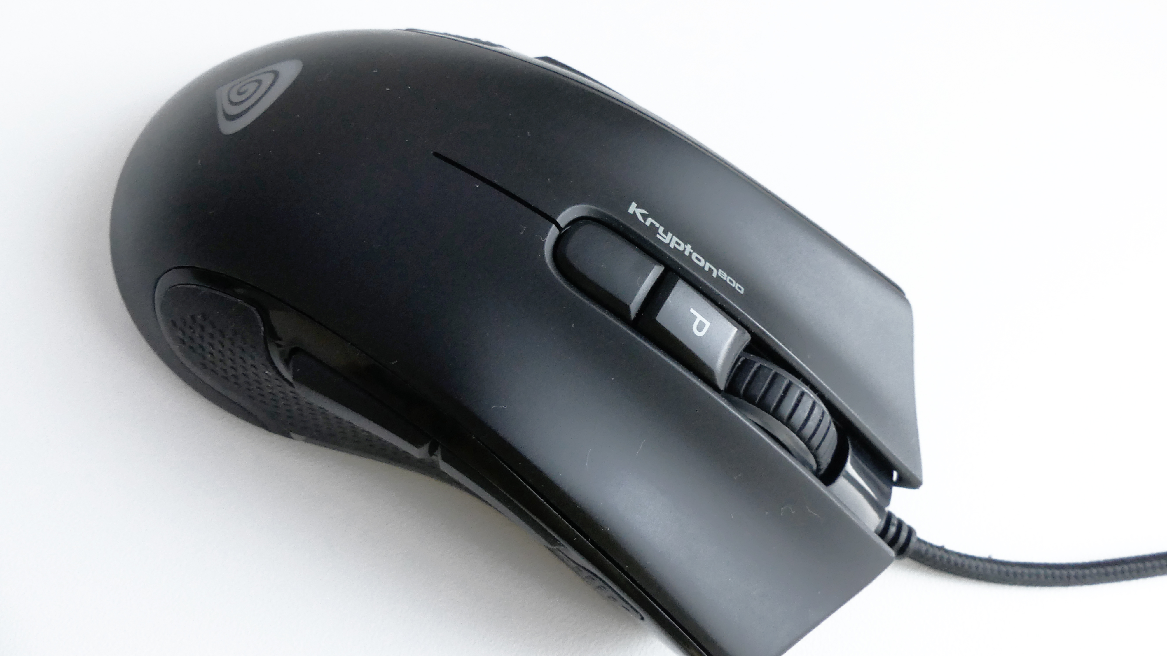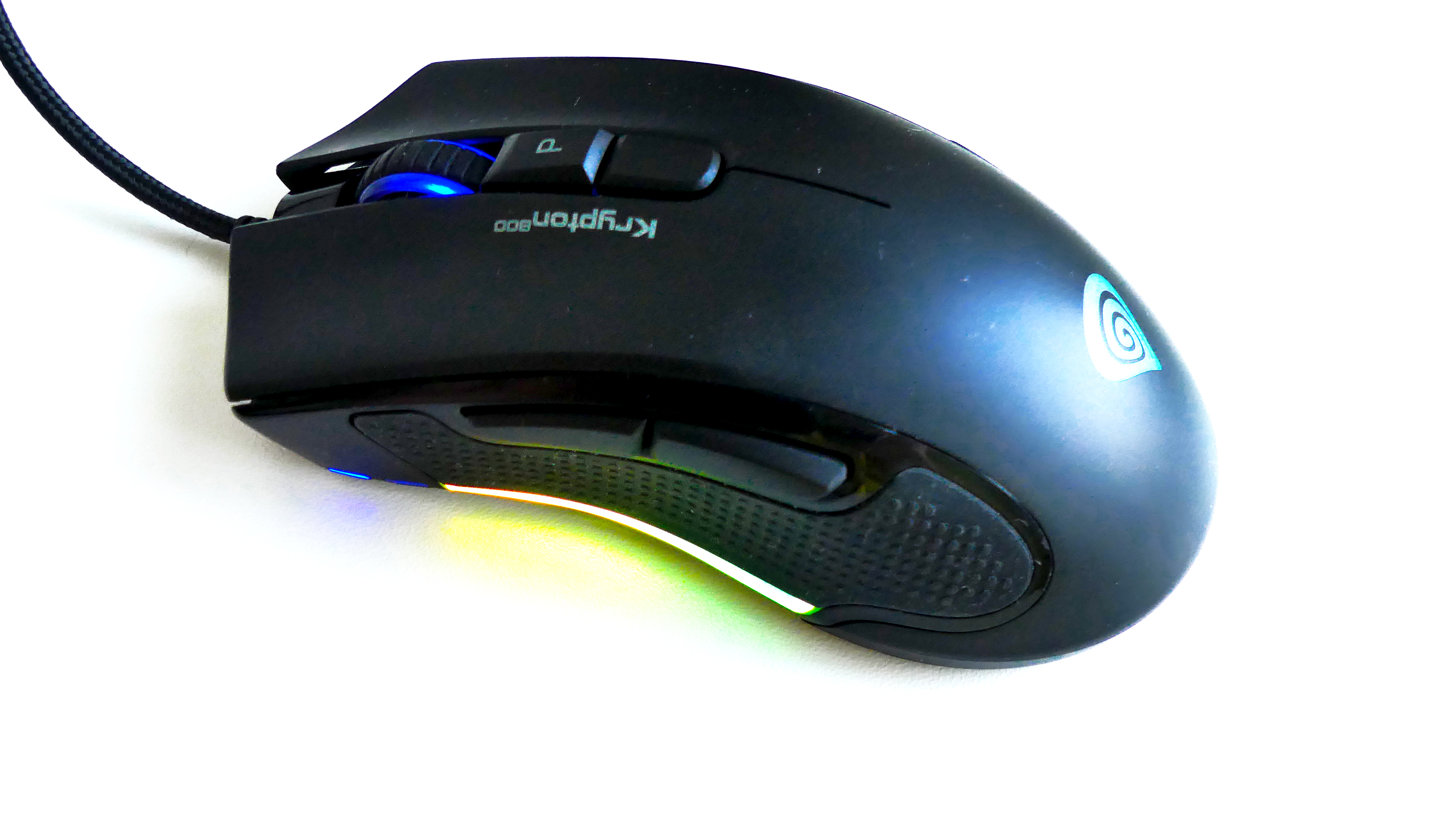 Paradoksalnie, w temacie wykonania Kryptona 800 mam pewne zastrzeżenia, w przeciwieństwie do o 100 złotych tańszego GV44, ale nie są to jakieś katastroficzne wady. Krypton wciąż zbudowany jest z tak samo przyjemnego, aksamitnego plastiku, który ma trudności, aby się zabrudzić, a do kabla USB (1,85 m) zastosowano oplot i jeden rzep. Jest to mysz o ergonomicznej długości, przez co cała dłoń leży wygodnie, a nadgarstek nie wisi w powietrzu jak ma to często miejsce przy myszach krótszych. Zastrzeżenia mogą budzić jedynie dwa miejsca na urządzeniu. Pierwszym z nich jest plastik wzbogacony chropowatą gumą (po bokach myszy), który ugina się tuż nad iluminującym, przezroczystym elementem. Drugi, bardziej drażniący problem, ujawnia się podczas używania scrolla, zwłaszcza wilgotnymi dłońmi, które zapewne pocą się nie tylko mi, gdy naciera horda przeciwników. Dwa przyciski, służące do zmiany DPI oraz zmiany programu znajdujące się właśnie pod scrollem często „klekoczą” przyklejając i odklejając się od palca leżącego na rolce. Niestety, nie tylko mokre paluchy wywołują ten efekt. Wystarczy moment przypadkowego szturchnięcia przycisków i już czuć ich niestabilność i kolebanie się we wszystkie strony. Jest to trochę drażniące, bo zdecydowanie odstaje jakością wykonania od reszty Kryptona.