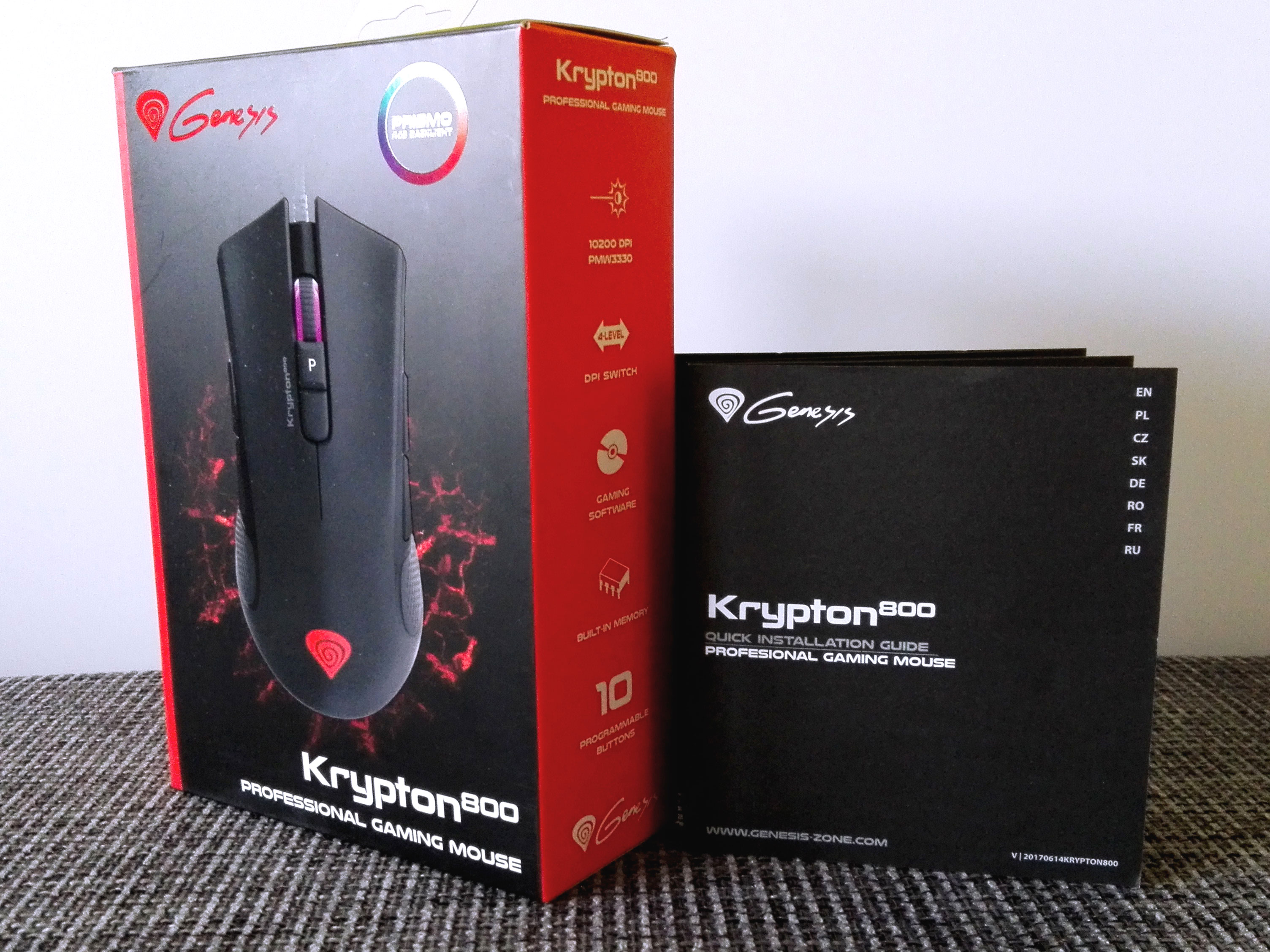 Pierwsze, co dostrzeżemy na opakowaniu, to logo technologii podświetlania RGB o nazwie PRISMO, której omówienie znajdziecie w dalszej części testu. Co poza tym? Dostaniemy maksymalną rozdzielczość na poziomie 10 200 DPI, regulowane czterostopniowe DPI, wbudowaną pamięć i 10 programowalnych przycisków. Zawsze możemy też skorzystać z oprogramowania, które znacznie rozbudowuje możliwości myszy. Oto Krypton 800 w dużym skrócie. A teraz rozwińmy nieco te istotne, jednak zdawkowe informacje. Trzeba się przecież dowiedzieć w praktyce, jak marketing sprawdza się w rzeczywistości.