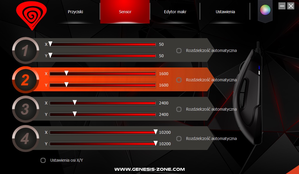 Jak można było się spodziewać, makr (oraz samych profili) bez software’u nie ustawimy. Klawiszem znajdującym się poniżej przycisku P można jedynie ustawić czułość sensora. Są to domyślnie rozdzielczości 800, 1600, 2400 oraz 3200. Jednak już po uruchomieniu programu wartościami tymi możemy manipulować, przypisując własne do wszystkich czterech modułów. Są to więc zakresy od 50 aż do 12 000 DPI, które za pomocą suwaków ustawiamy płynnie, co 1 punkt DPI. O tym, który z podręcznych czterech modułów DPI jest aktualnie używany, informują nas dwie malutkie niebieskie diody po obu stronach myszki. Pierwszy poziom DPI sygnalizowany jest zapaleniem się pierwszej z nich, drugi poziom podświetlany jest przez oba zapalone LEDy, trzeci to świecąca jedynie druga dioda, a czwarty – wygasza obie. Trzeba też wiedzieć, że ustawienia rozdzielczości nie można przypisać razem z makrami do konkretnego programu. DPI możemy zmieniać czy to w locie, czy poprzez oprogramowanie niezależnie od nich.