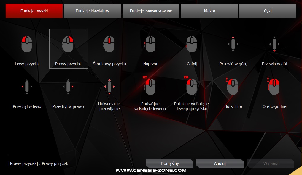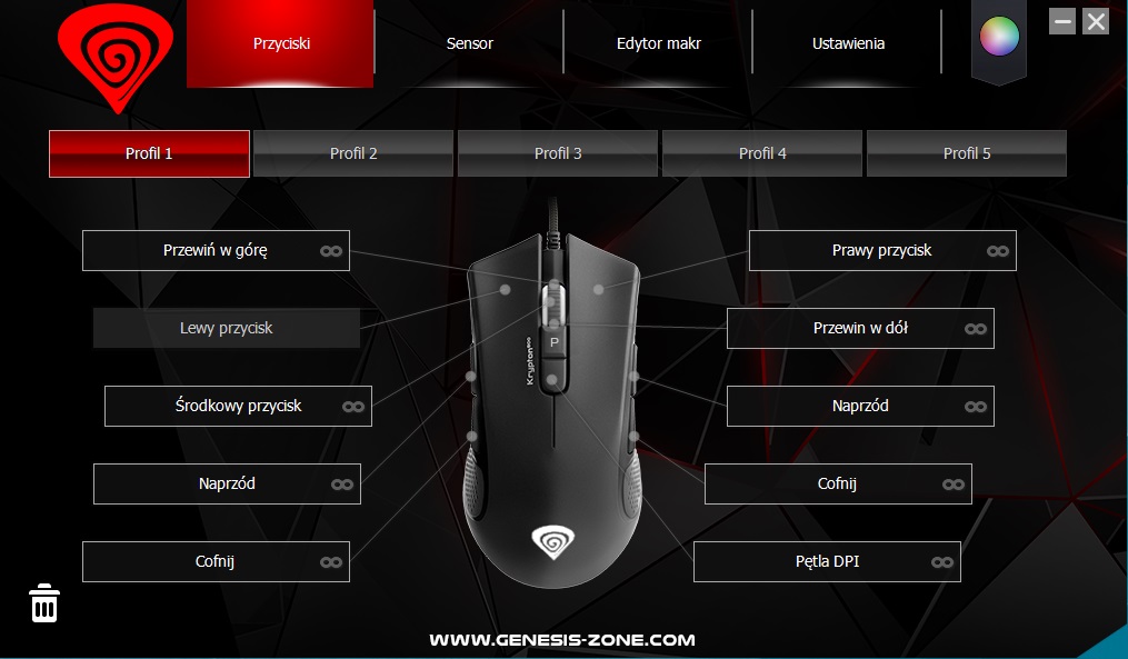 Oprócz określenia czułości DPI, program pozwoli nam także na dostosowanie wszystkich pięciu profili według potrzeb, w tym wszystkich klawiszy i makr. Pod dowolny przycisk możemy więc przypisać dowolny kapsel z klawiatury bądź funkcję multimedialną, a pod makra określony ruch myszy, częstotliwość, powtarzalność… Na ilość funkcji do zaprogramowania nie można tu narzekać. Oprogramowanie jest naprawdę niezwykle rozbudowane i pozwala nawet odwrócić osie myszy.