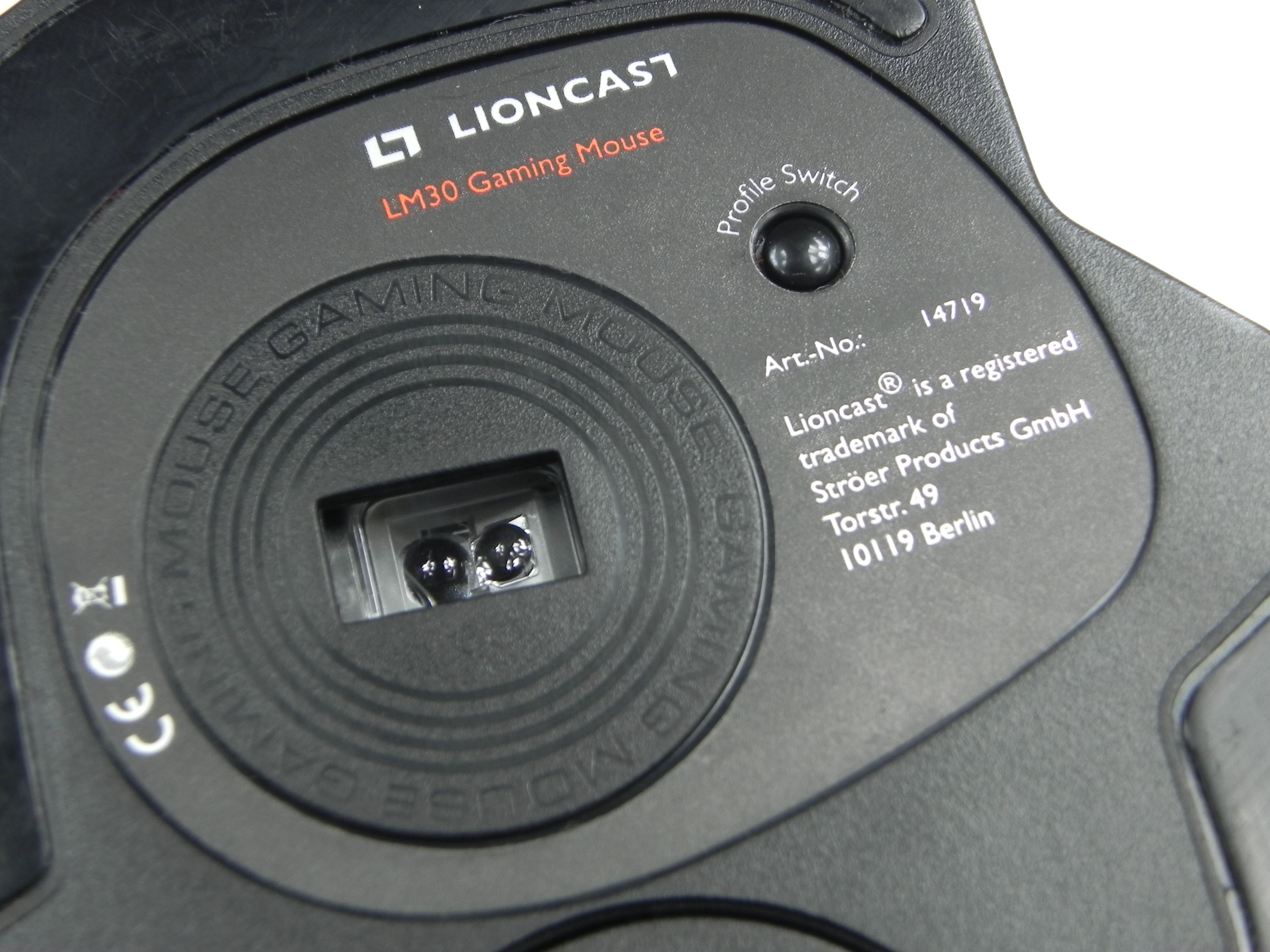 Zanim zerkniemy na niemniej ciekawy spód myszki, warto wspomnieć, że sprzęt posiada sześć stref oświetlenia. Oprócz fantastycznie prezentującego się scrolla, klawiatury na lewej ściance i wskaźnika DPI, mamy również podświetlane logo Lioncasta na grzbiecie gryzonia i dwie lampki pomiędzy plecionym kablem USB o długości 190 cm. Logo prezentuje się całkiem nieźle choć widać, że w środku znajduje się mała lampka, która nie oświetla logotypu równomiernie. W rezultacie część tego elementu wydaje się być niedoświetlona w zależności od kąta patrzenia. Lepiej za to prezentują się lampki na przodzie gryzonia w kształcie strzałek – wyglądają niczym światła od sportowego samochodu i nadają sprzętowi futurystycznej nutki. Lioncast LM30, dzięki bogatej iluminacji, nabiera niepowtarzalnego charakteru i trudno wyobrazić go sobie w skromniejszym wachlarzu światełek.