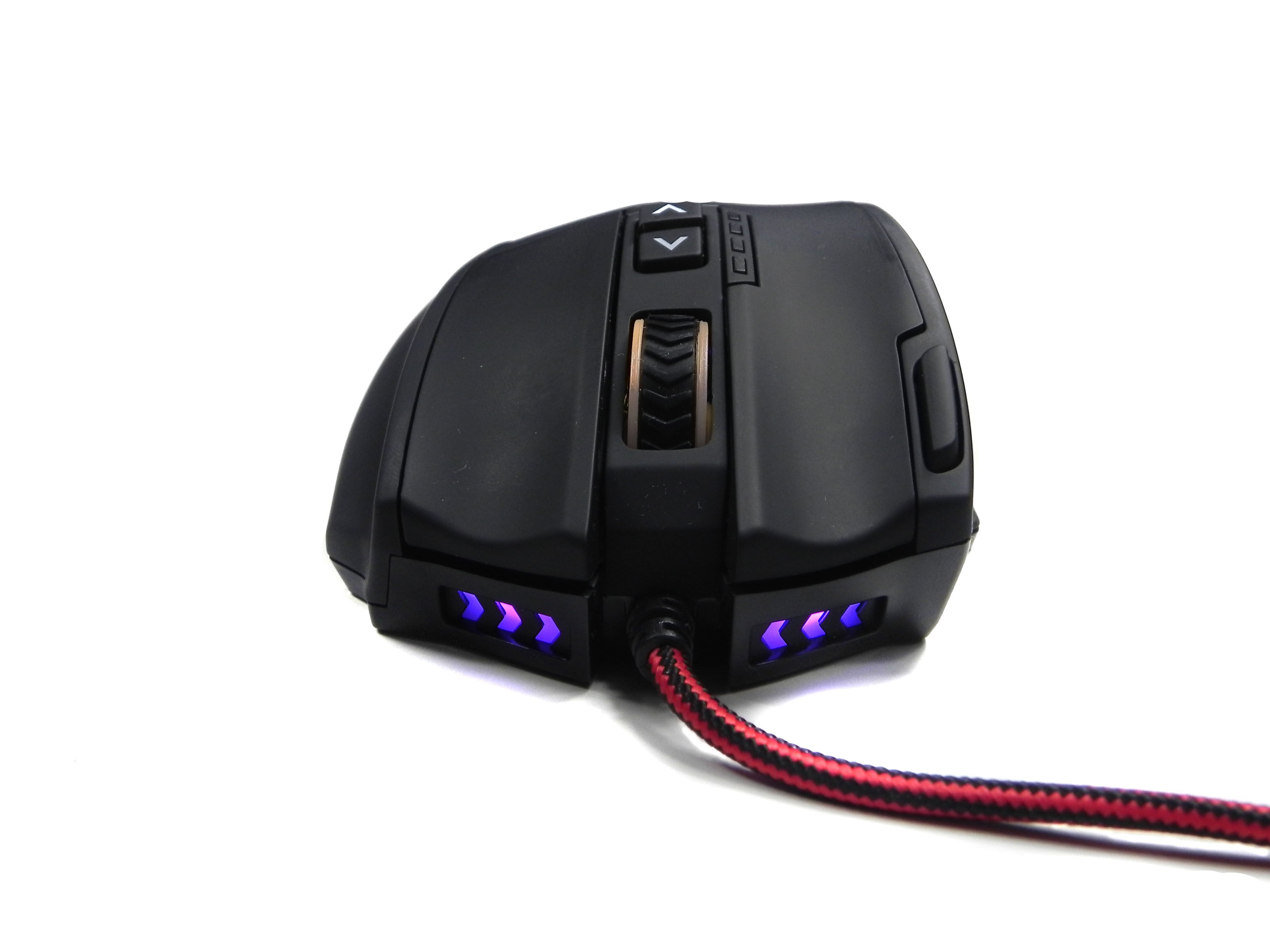 Myszka posiada przyjemny w dotyku scroll z wypukłymi strzałkami, który działa bardzo lekko. Po jego bokach znajdują się dwa podświetlane paski, które świetnie komponują się z tym jakże ważnym elementem. Nieco niżej mamy przełączniki DPI – tu również Lioncast nie poszedł w sztampę. Rozdzielczość zmieniamy za pomocą dwóch przycisków, z których jeden znajduje się wyżej od drugiego. Możemy zatem zmniejszać lub zwiększać zapisane wartości DPI, a przez to, że guziki są stosunkowo szerokie i lekko pracują, jest to niezwykle wygodne. Miłym detalem jest wskaźnik poziomów rozdzielczości w postaci czterech diod, co również pomaga nam oszczędzić cenny czas.