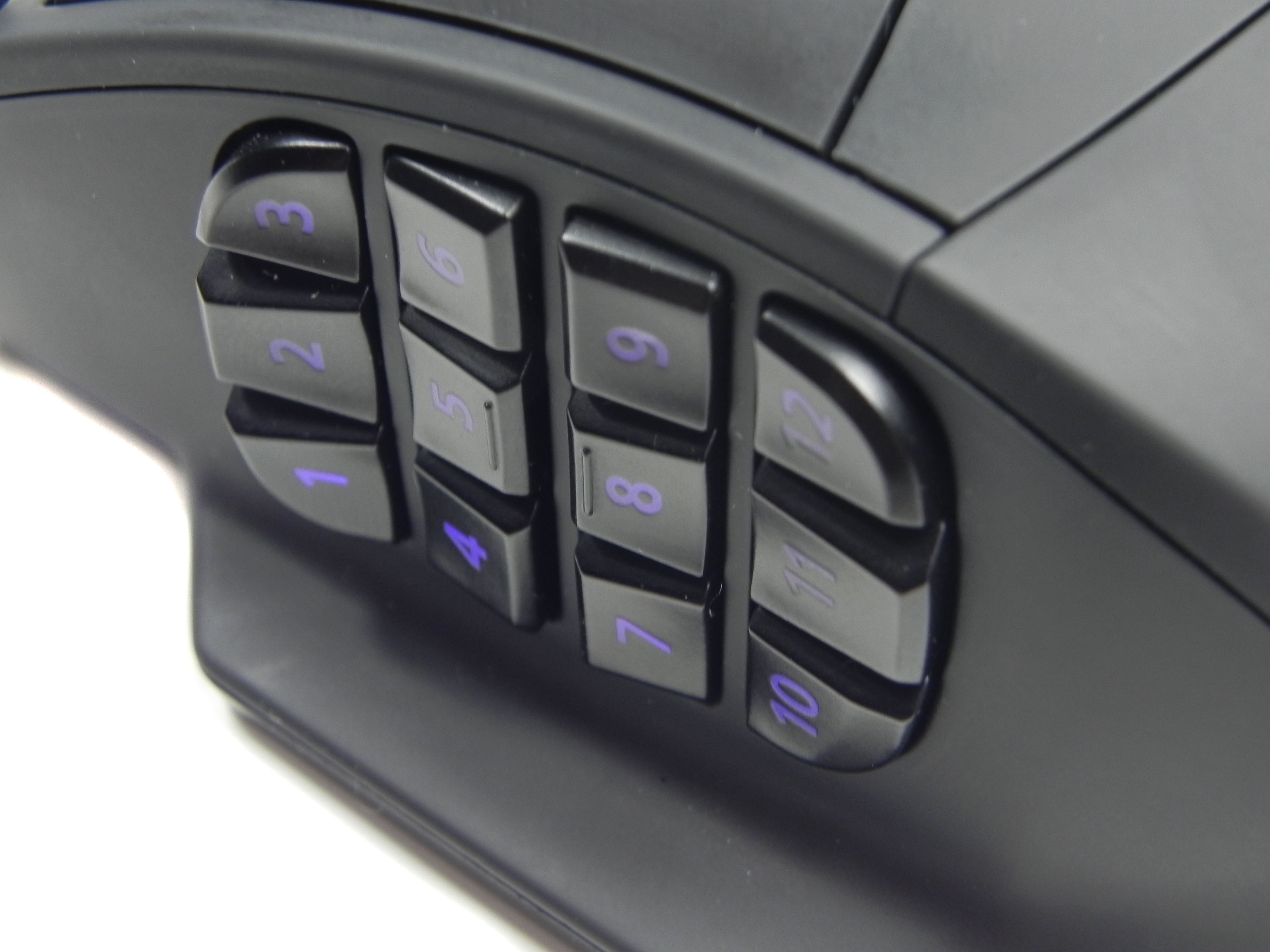 Po wyjęciu z pudełka myszki pierwsze, co rzuca się w oczy, to 12-numerowa podświetlana klawiatura, która w zamyśle producenta ma zastąpić część funkcji przypisanych do klawiatury komputerowej i przyśpieszyć rozgrywkę. Guziki, co istotne, zwrócone są do siebie pod niedużym kątem, co bezsprzecznie pomaga w wygodzie użytkowania. W swoistej nawigacji po zbiorze tych przycisków wspierają nas również małe wypustki na guzikach z numerami 5 i 8, od których możemy bez patrzenia dokonywać konkretnych wyborów. Kolejny przydatny detal znajduje się przy podstawie myszki – to fragment plastiku wystający poza jej sylwetkę, na którym można oprzeć kciuka. Widać, że ciekawy dodatek w postaci mini-klawiatury został rozsądnie przemyślany. Prezentuje się solidnie, acz zwyczajnie na tle nieco krzykliwej reszty.