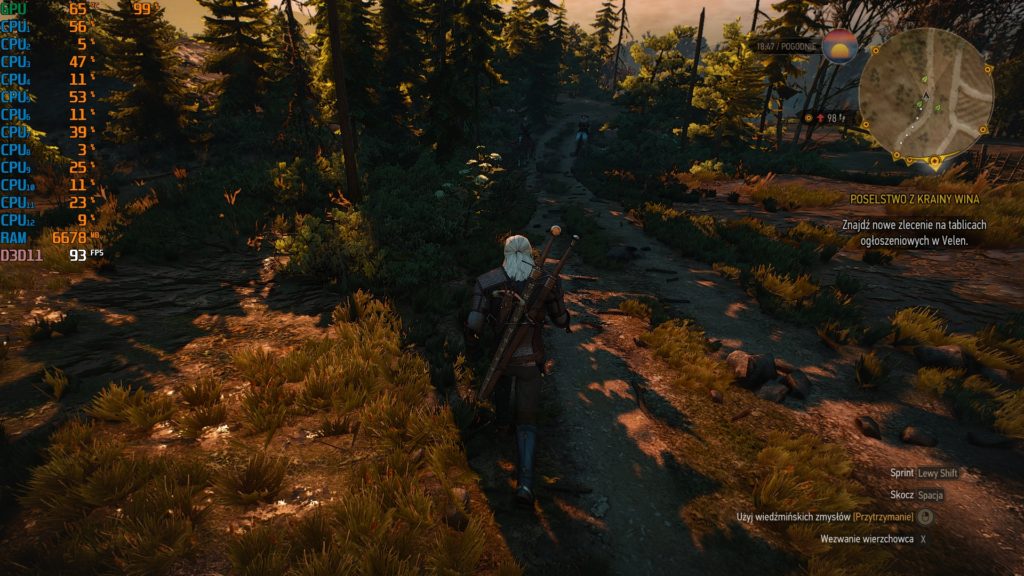 - Ustawienia Wysokie (HBAO+ ON, AA ON, NVidia HairWorks 4x) – uśrednione 62 fps.