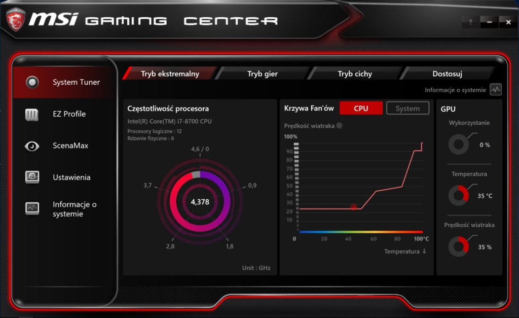 I tak też faktycznie jest. Za pomocą MSI Gaming Center dostosujemy m.in. prędkość wentylatorów w zależności od tego jaką temperaturę wydzielać będzie procesor. Ale to nie wszystko. Program pozwoli na ustawienie dwóch trybów (tryb roboczy i tryb gier), a każdy z nich może mieć inne ustawienia obrazu, dźwięku, motywu Windows czy predefiniowanego natężenia audio. Tutaj też wybierzemy czy chcemy uruchomić kilka elementów jak sieć WI-Fi, dioda LED informująca o działaniu dysku twardego czy technologię Super Charger pozwalającą na szybsze ładowanie urządzeń (np. mobilnych) poprzez interfejs USB 3.0. Przydatne i bez zbędnych śmieci.