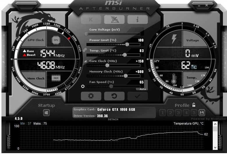 Kartę graficzną w MSI AEGIS 3 zamontowano w ułożeniu pionowym, co ma między innymi polepszyć cyrkulację powietrza i docelowo pozwolić na niższe temperatury GPU, ale ułożenie takie ma także służyć bezpieczeństwu w trakcie transportu. Standardowe, równoległe do podłoża montowanie kart może skutkować np. wyłamaniem złącza PCI Express, bądź mniejszej stabilności samej karty w podróży. Czemu by to miało jednak nie służyć – służy dobrze i dobrze przy tym wygląda. GTX 1060 będziemy mogli nieco podkręcić w programie MSI Afterburner (o tym nieco niżej) i wówczas to przekonamy się, że karta niestety hamuje moc procesora, co było do przewidzenia po poznaniu samych suchych parametrów zestawu. Grunt jednak, że można kartę nieco podkręcić.