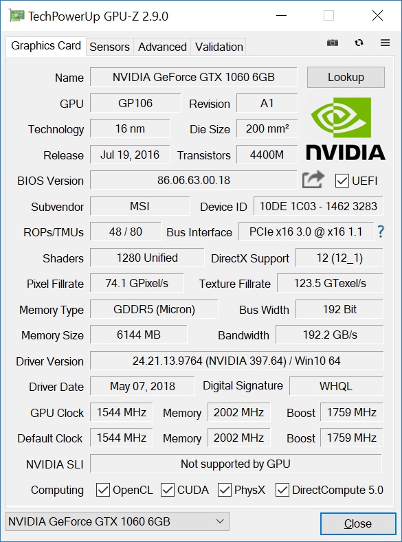- Karta graficzna dedykowana: NVIDIA GeForce GTX 1060 6GB, MSI