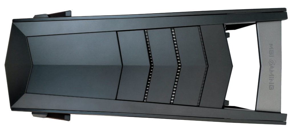 Góra obudowy – cóż, w oderwaniu od całości wygląda dość pokracznie, ale zapewniam że na żywo stanowi zacne dopełnienie designu obudowy. Nie ma tu miejsca na otwory wentylacyjne, a jedynie na elementy dekoracyjne jak widoczne poniżej cztery paski przecinające górę obudowy wszerz. W rzucie z góry dostrzeżemy także wygodną rączkę z logo MSI Gaming, która na żywo nie wygląda tak nienaturalnie jak – trzeba przyznać – na poniższej fotografii.
