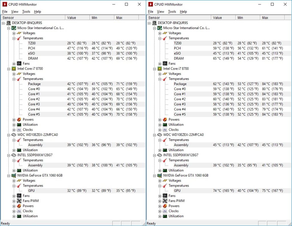 Jakby to wszystko dobrze nie wyglądało i jakich by to fpsów nie dostarczało to trzeba przyznać, że testowany zestaw pod kątem temperatur i hałasu pozostawia nieco do życzenia. O ile temperatury w czasie spoczynku nie budzą zastrzeżeń, to w trakcie gry już tak. Nie pomaga zbytnio pionowe zamontowanie karty graficzne, które w teorii miało pomóc w obniżeniu temperatury, a kwestia grzania się procesora (który dzięki 14 nm litografii powinien grzać się mniej niż wersje wcześniejsze), to już w ogóle mała tragedia. Niby tych 84°C to nie jest jeszcze jakiś koniec świata, ale dobrze jest wiedzieć, że w konkurencyjnych modelach potrafiono uzyskać temperatury nawet o 30°C niższe.