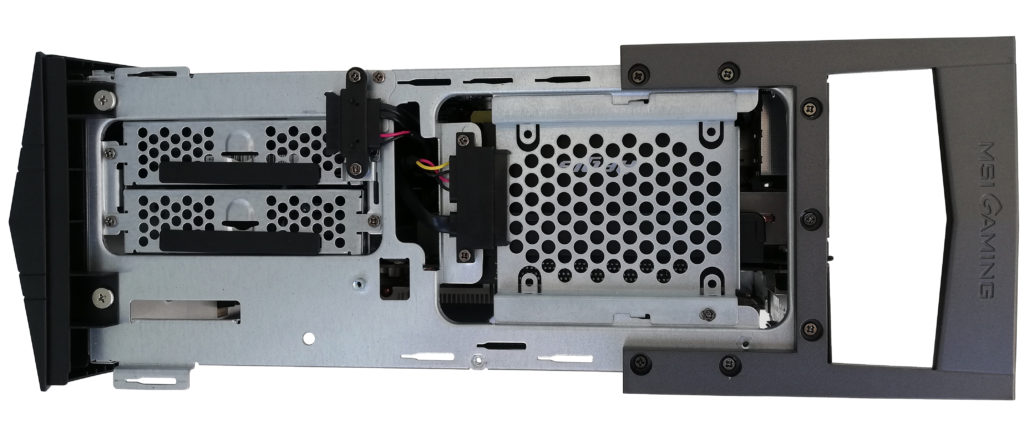 Po zdjęciu lewego boku ujrzymy wycinek płyty głównej, w którego miejscu zamontowano pamięć SSD M.2 (128 GB) oraz pamięć SSD Intel Optane (16 GB). Tutaj też znajdziemy miejsce na dodatkową kość pamięci RAM w formacie SODIMM, czyli spotykanym najczęściej w laptopach (z uwagi na rozmiary). Z tej strony nie wyczarujemy już nic więcej, pora więc na stronę drugą – prawą. Tutaj króluje karta graficzna produkcji MSI. W testowanym modelu znalazła się karta klasy średniej Nvidia GeForce GTX 1060 z 6 GB pamięci VRAM. Pod nią znajduje się (niewidoczny na pierwszy rzut oka) cooler spoczywający na procesorze, a także 8 GB pamięci RAM. Z kolei nad kartą odnajdziemy pasek diod LED, które są drugim (po froncie) miejscem, które jest w zestawie podświetlone. Widzimy też, że płyta główna oferuje aż 5 złączy SATA, co z pewnością docenimy. Po lewej stronie za kartą graficzną skrywa się jeszcze dysk HDD, do którego dostaniemy się już od góry. Na wierzchu desktopu znajdują się bowiem dwie szuflady na 3,5-calowe dyski. Tutaj także znajdziemy jedną szufladę na dysk 2,5-calowy. Bardzo ciekawe, wygodne rozwiązanie.