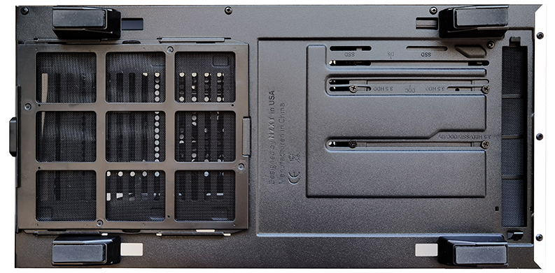 Mówiąc szczerze, top obudowy to taki trochę „designerski potworek”. Zauważymy tu bowiem niespecjalnie gustowną siatkę wentylacyjną górnego wentylatora oraz kilka portów. Prócz włącznika odnajdziemy tu zaledwie dwa porty USB (jeden Typu A i jeden Typu C) oraz złącze 3,5 mm jack. W czasach gry operujemy tak wieloma urządzeniami zewnętrznymi, może być to po prostu trochę mało, a jeśli nasza płyta główna nie jest bogata w port USB 3.1 (2. generacji), to złącze USB-C pozostanie nieaktywne. Zupełnie po drugiej stronie, a więc na spodzie obudowy skrywa się kolejny filtr przeciwkurzowy, wyciągany i montowany w prosty sposób, bo obdarowany plastikową ramką. Ze spodu dowiemy się również, że zamontowana wewnątrz ramka na dyski jest przesuwna (dokręcana śrubkami w dogodnym miejscu), dzięki czemu możemy manipulować jej położeniem, zwiększając np. ilość miejsca na zasilacz.