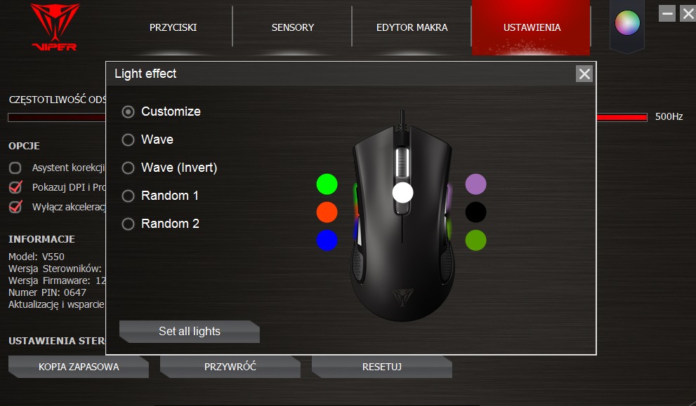 Dla poprawy estetyki naszego gryzonia została zakładka „Efekty świetlne”, choć w oprogramowaniu nie jest podpisana i widnieje jako kolorowe koło. Klikając w nie włącza nam się dodatkowe okienko z modelem myszki, na którym zaznaczono strefy podświetlenia. Generalnie jest ich aż osiem, programowalnych siedem, choć spoglądając na gryzonia można mylnie rzec, że raptem cztery. Trochę to zwariowane, więc ruszam z wyjaśnieniami. W V550 możemy operować na siedmiu, że tak to ujmę, lampkach, ósma zaś (nieprogramowalna) odpowiada za podświetlenie logo producenta na grzbiecie – zieloną głowę żmij. Myszka po bokach posiada dwie listwy z iluminacją, z których każda podzielona jest na trzy strefy. Możemy więc ustawić je zarówno w jednolitym kolorze, jak i w kilku odmiennych. Ostatnim miejscem, gdzie decydujemy o kolorze i natężeniu światła jest zgrabny scroll – tutaj niestety nie możemy podzielić obydwóch stron na różne wariacje świetlne. Ustawienia świetlne pozwalają nam na wybór przebogatej palety kolorów RGB, dodawanie efektów świetlnych takich jak fala, fala w przeciwnym kierunku, czy „oddech”. Jest solidnie, lecz bez fajerwerków. Producent udostępnia nam stosunkowo podstawowe opcje modyfikacji oświetlenia, brakuje jednak kilku trybów iluminacji znanych z innych modeli myszek. Konfiguracja jest jednak dziecinnie prosta i nie zajmuje dużo czasu, a to niepodważalny plus przykrywający drobne braki.