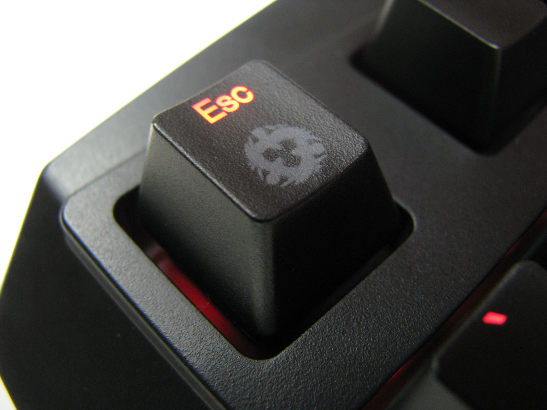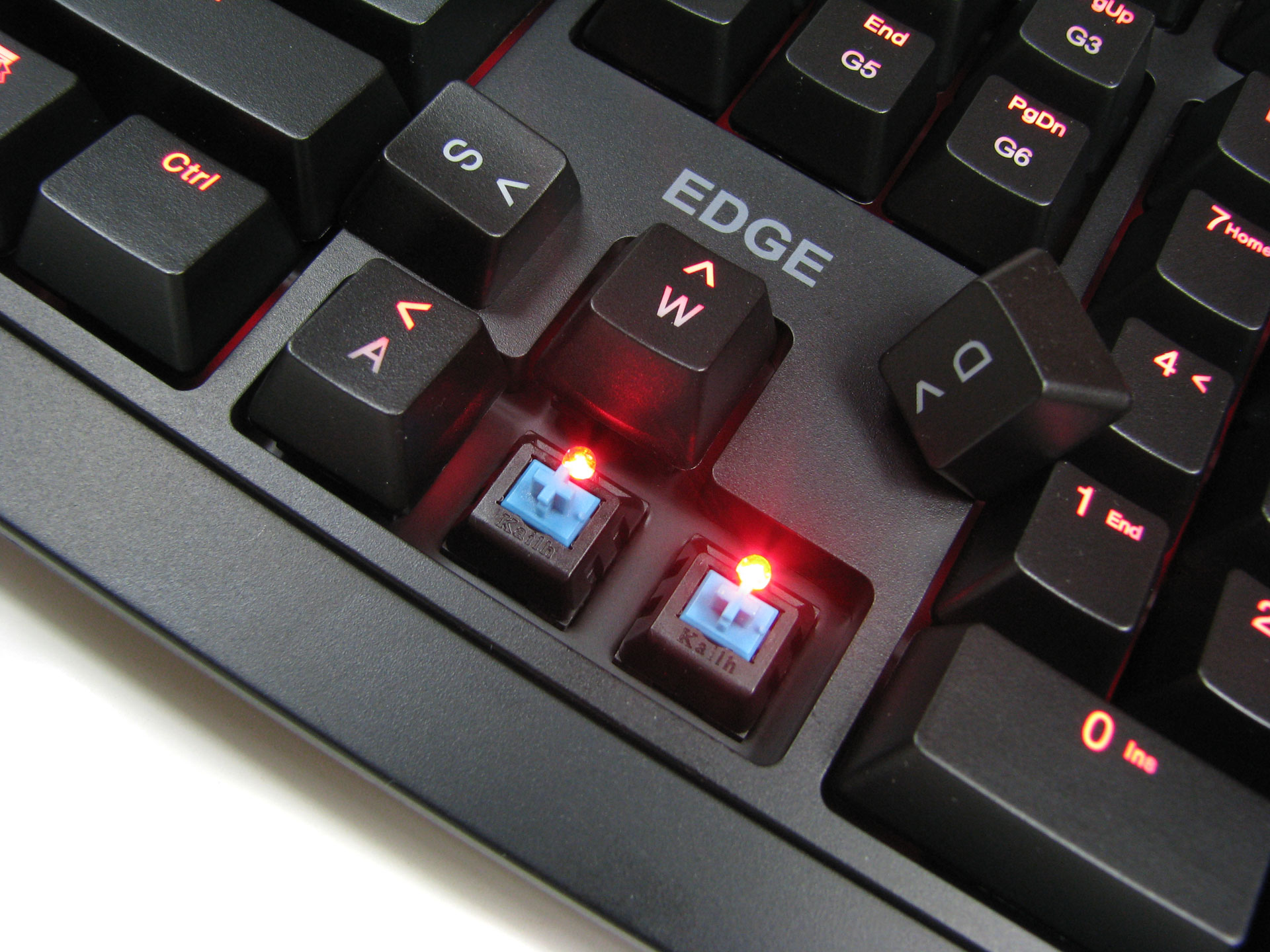 Na uwagę zasługuje oczywiście przycisk Gmode, który jest w zasadzie nieodzowną częścią każdej klawiatury dla gracza. Jeśli go włączymy (co jest sygnalizowane diodą zaraz nad przyciskiem), zablokujemy kapsel Win oraz będziemy mogli skorzystać z kolejnego dobrodziejstwa Ravcore Edge – sześciu przycisków macro, zgrupowanych w bloku tuż nad kursorami i oznaczonych od G1 do G6.