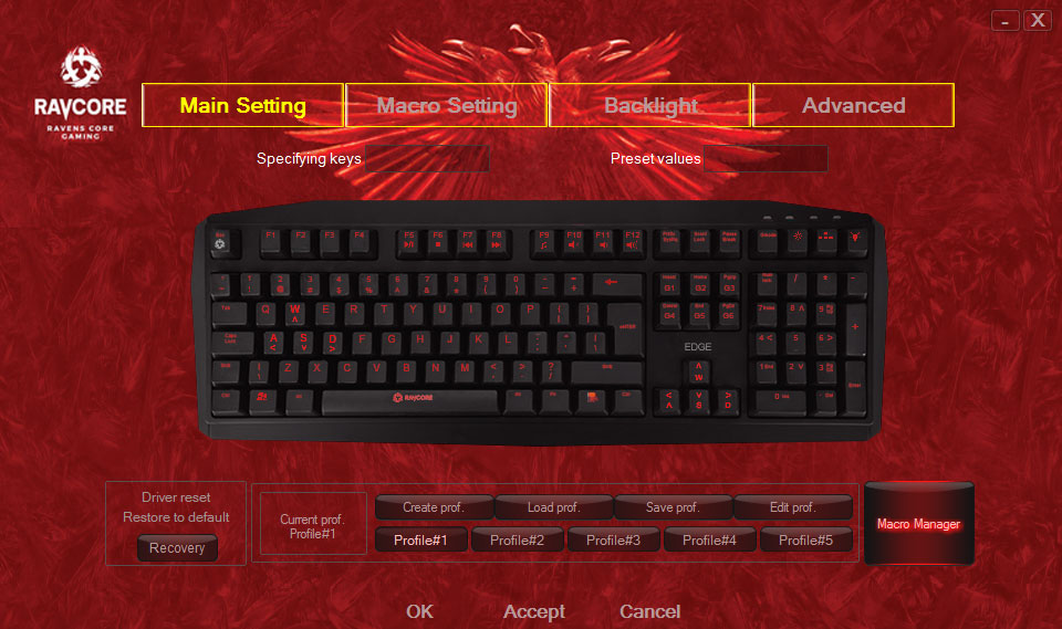 Pierwsze odpalenie specjalnego oprogramowania do Ravcore Edge nie przynosi ze sobą zbyt pozytywnego wrażenia. Sądziłem, że skoro mamy już do czynienia z polskim mechanikiem, to i jego oprogramowanie przywita nas rodzimymi znakami. Co prawda w opcjach odnalazłem zmianę języka, lecz na rozwijanej liście znajduje się… tylko angielski. Zatem jedynie w języku Szekspira przyjdzie nam obcować z oprogramowaniem sprzętu. Co więcej, obsługa wszystkiego nie jest zbyt intuicyjna i potrzeba kilku chwil, by połapać się w ustawieniach. Po kilku minutach czujemy się jednak w oprogramowaniu mechanika jak ryba w wodzie.