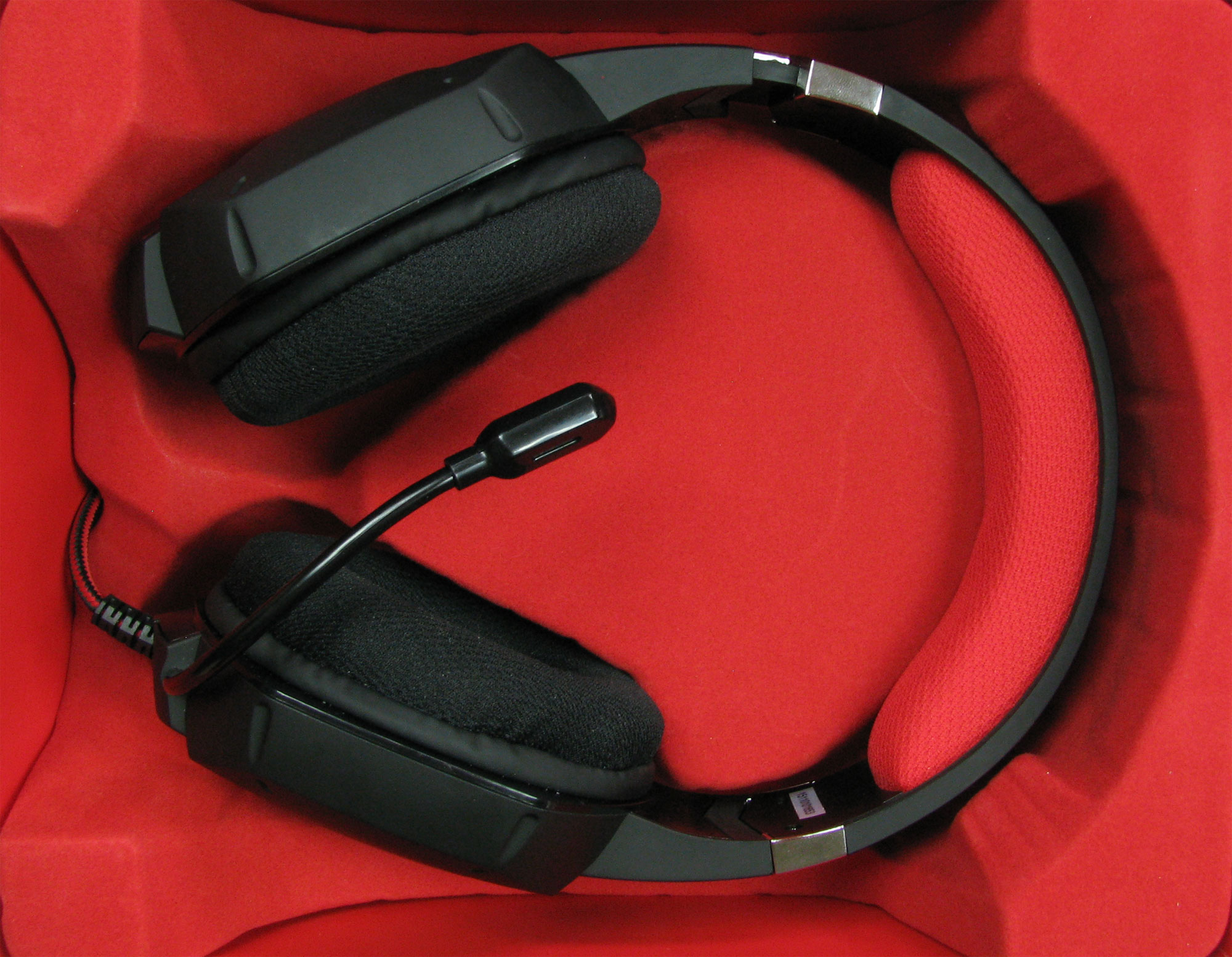 Kończąc opis wyglądu słuchawek wspomnieć należy oczywiście o elastycznym mikrofonie, który możemy włączyć/wyłączyć za pomocą przełącznika znajdującego się na lewym nauszniku. Znajdziemy na nim również – tyle że niżej – pokrętło regulacji głośności. Jak można się zatem domyślić, Trust GXT 322 Dynamic Headset nie posiada pilota umiejscowionego na kablu, który – jeśli już o nim wspominam – jest solidną plecionką o długości 3 metrów, choć nie wiedzieć czemu producent uparcie podaje na swojej stronie internetowej, że przewód to jedynie 2 metry długości, co przeczytamy nawet na opakowaniu sprzętu. Czy dostałem zatem w moim egzemplarzu metr przewodu ekstra, czy może materiały promocyjne słuchawek są przekłamane? Radzę przed kupnem zapytać w sklepie o zmierzenie plecionki i tyle. Kontynuując wcześniejszy wątek – wszystkie funkcje słuchawek obsługujemy sięgając dłonią do lewego ucha, podczas gdy kabelek spoczywa spokojnie pod biurkiem. Zaraz, zaraz – wszystkie funkcje? Tak i więcej po testowanym sprzęcie się nie spodziewajcie.