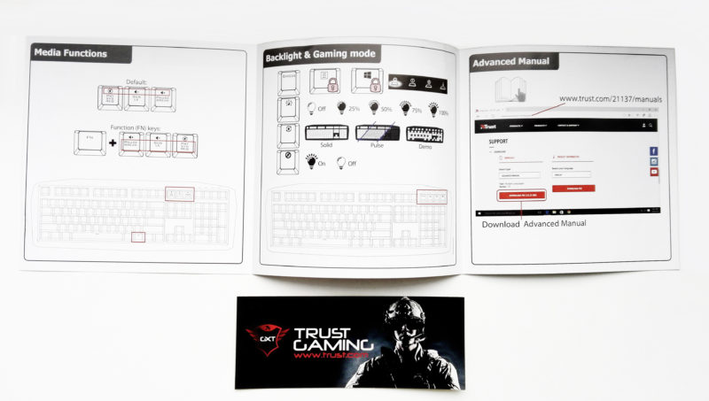 Pod mechanikiem znajdziemy obrazkową instrukcję, więc nie potrzebujemy znajomości angielskiego, aby zrozumieć podstawowe funkcje klawiatury. Jeśli potrzebujemy rozbudowanego manuala, jest on do ściągnięcia ze strony producenta. Tutaj znajomość angielskiego jest konieczna, gdyż instrukcji w języku polskim brak. Dodatkowo, w naszym zakupie za cztery paczki dostaniemy… naklejkę, którą prawdę mówiąc twórcy mogli sobie już darować.