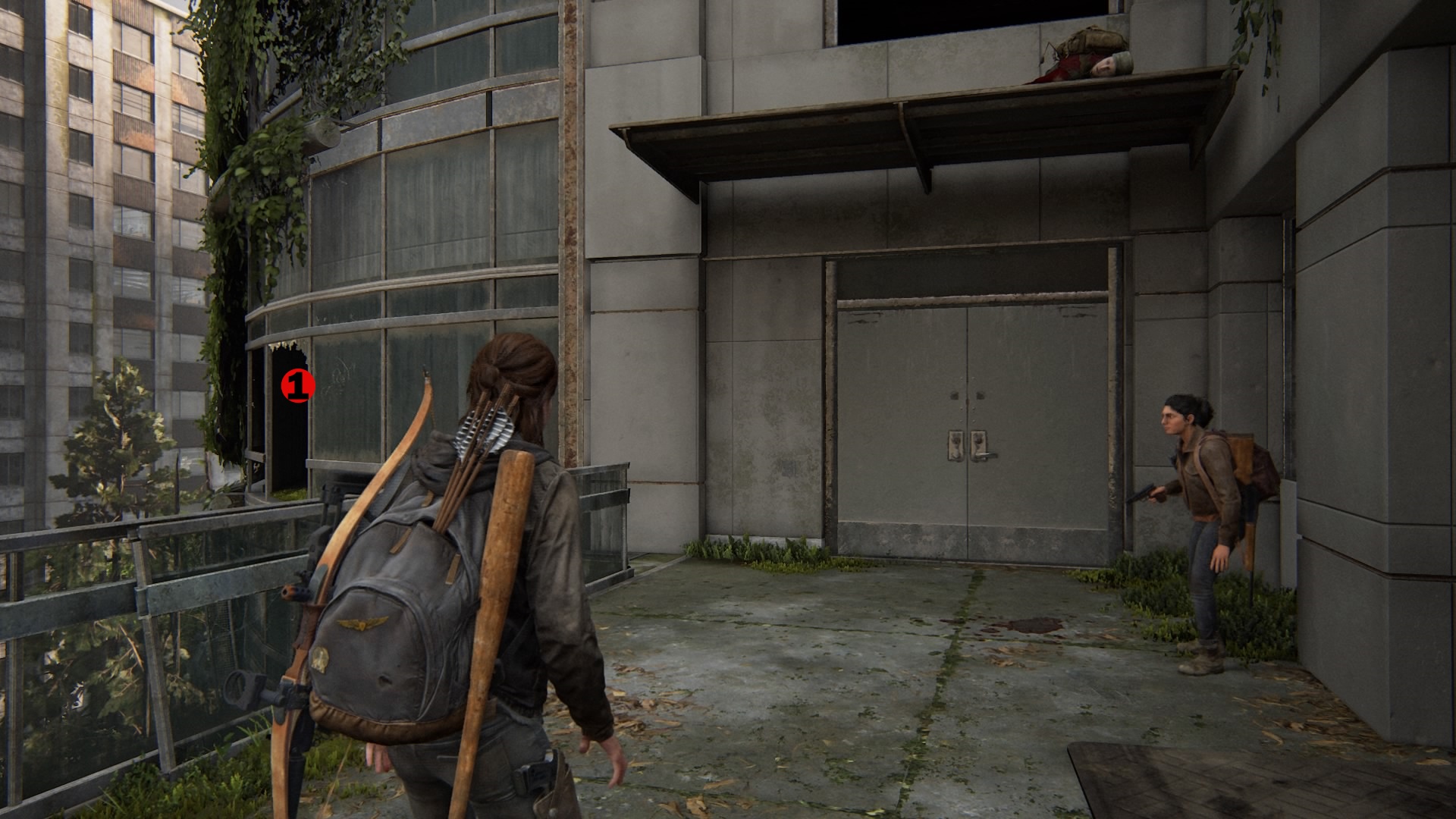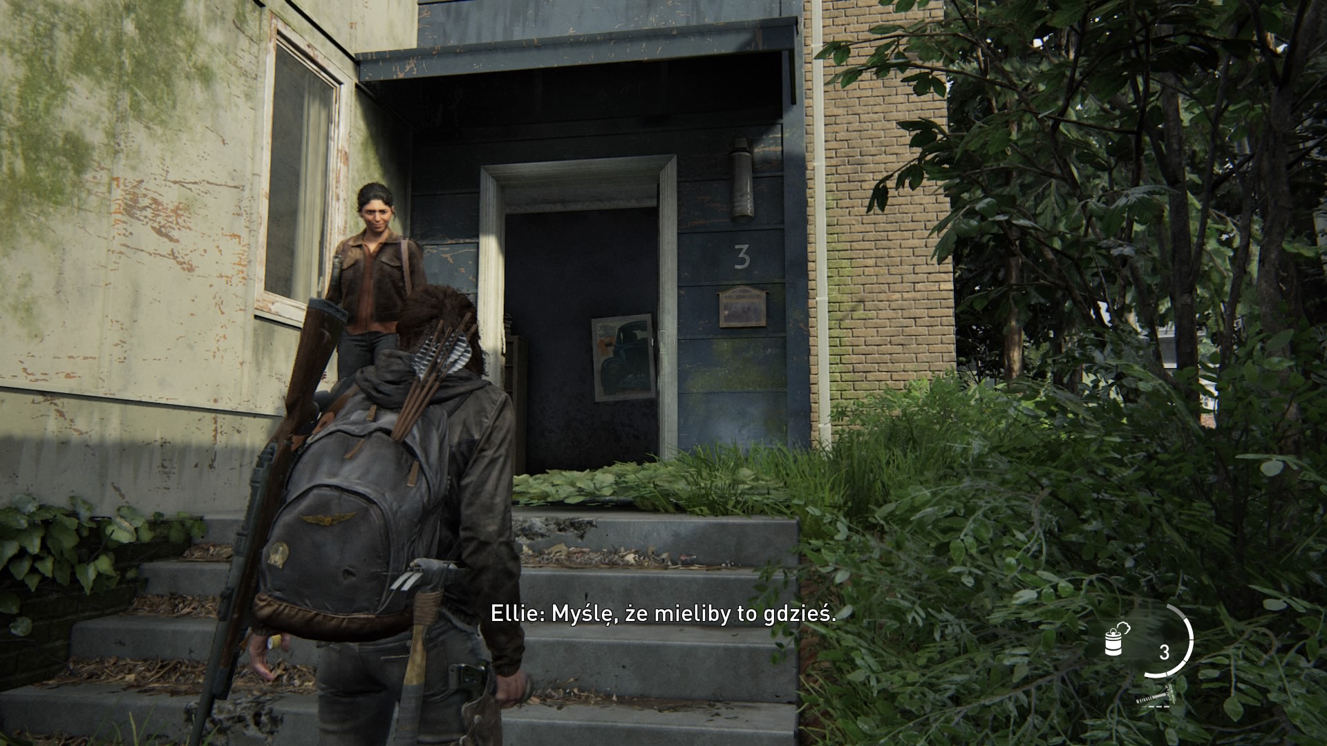 Przeszukaj biuro i wejdź po schodach do góry. Gdy zlustrujesz otoczenie na piętrze, przejdź przez uchylone drzwi, a rozpocznie się scenka. Wracając do lokacji z wisielcami, zostaniesz zaskoczony przez oddział żołnierzy WLF. Pokonaj wrogów i opuść wraz z Diną budynek. Nie uda się tego niestety zrobić niepostrzeżenie, więc czeka Was ucieczka przed bojówkarzami. Dotrzecie do miejsca gdzie bytują zarodniki, więc bohaterki sięgną po maski (mimo, że Ellie nie jest potrzebna).