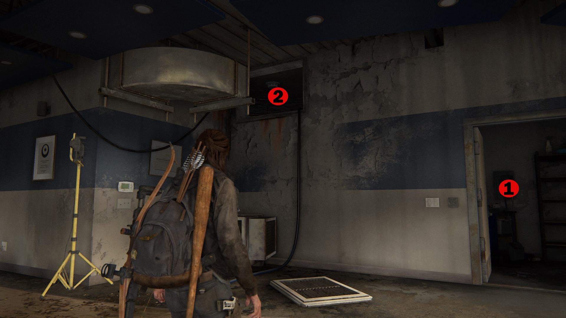 Gdy znajdziesz się w środku budynku, zmierzaj do miejsca widocznego na obrazku poniżej. Przejdź przez drzwi prowadzące do magazynku (1), a następnie wejdź do szybu wentylacyjnego (2).