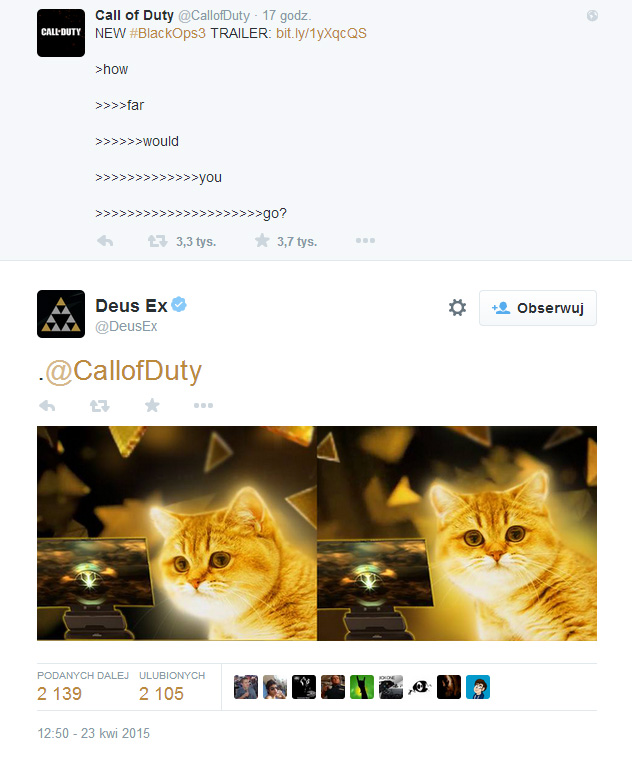 Na materiał od Activision odpowiedzieli żartobliwie twórcy Deus Ex: Mankind Divided, czyli panowie ze studia Eidos Montreal. W odzewie na twitta prezentującego filmik zamieścili fotkę dobrze znanego kociaka, który nie może pojąć, na co tak właściwie patrzy.