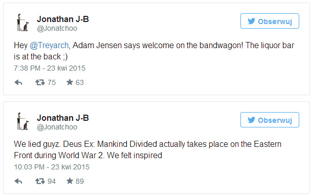 Jonathan Jacques-Belletete, który również pracuje nad Mankind Divided, powitał z kolei twórców Black Ops III na pokładzie. - Barek znajdziecie z tyłu - dodał z przymrużeniem oka. Następnie napisał w podobnym tonie, że tak naprawdę kłamali, a akcja Deus Ex: Mankind Divided przeniesie nas na front wschodni podczas II wojny światowej. - Poczuliśmy inspirację - wyjawia Jonathan Jacques-Belletete.