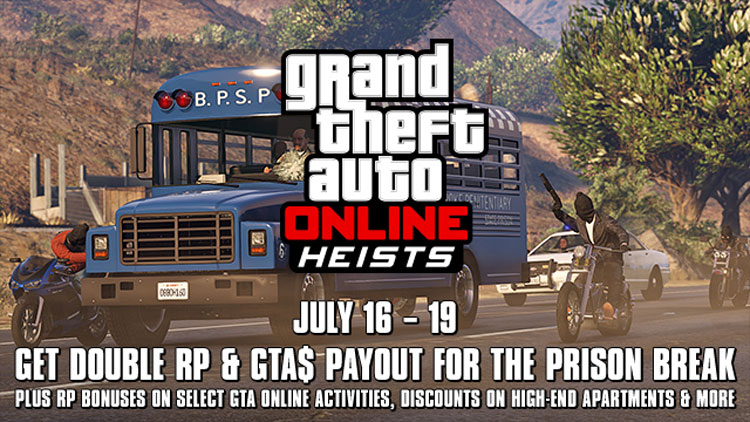 Od 16 do 19 lipca posiadacze GTA Online na wszystkich platformach zgarną podwójne doświadczenie (RP) oraz pieniądze za ukończenie napadu Prison Break (Ucieczka z więzienia). RP oraz GTA $ zostaną pomnożone przez dwa również za wykonanie niektórych aktywności w GTA Online, np. Szkoła Latania czy Zestrzelenie Samolotu.