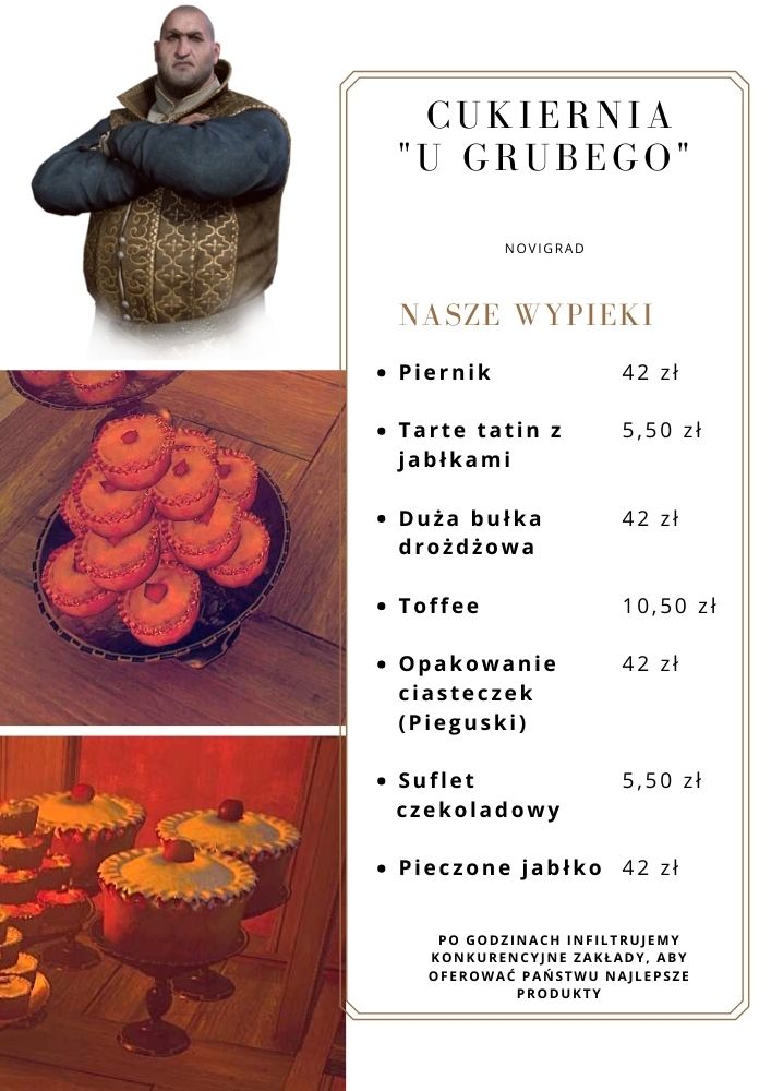 W takich chwilach, przy dobrym żarciu rzecz jasna, człowiek żałuje, że nie rozciąga mu się brzuch jak u węża. I w sumie odpuściłbym, gdyby nie ta urocza cukiernia z wystawką pełną wypieków. Ale chwilą, tę twarzyczkę właściciela skądś znam, jak i Wy. Djikstra zmienił zawód? Po wejściu do środka nie było po nim śladu, a ekspedient też za bardzo nie chciał (lub nie mógł) cokolwiek zdradzić. Skoro jednak już jestem, to może coś zinfiltruje… Menu niestety ma ogromny rozstrzał cen – mogłem się spodziewać, bo jakiś bezimienny kupiec podobny towar chciał mi opchnąć, na rozwidleniu dróg przed obozem nilfgardzkim na Ziemi Niczyjej. Drożdżówka za 42 zł? Pieczone jabłko i Pieguski to samo? Jeśli pomylili cukier z prochami, to nie mam pytań. Za to suflet czekoladowy zdaje się po terminie albo na Januszowej promocji – tak czy siak za 5,50 zł biorę!