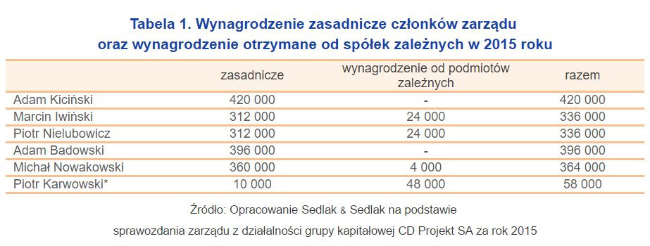 W 2014 roku suma wynagrodzeń, nagród i korzyści wypłaconych członkom zarządu wyniosła 2,2 mln zł. Znalazły się w tym premie w wysokości po 176 tys. zł, które odebrali dwaj członkowie zarządu. Z kolei wartość stałej części wynagrodzenia wyniosła w 2015 roku 1,9 mln zł (tabela nr 1), lecz to nie wszystkie pieniądze, które trafiły do kieszeni członków zarządu CD Projekt. Spółka posiada bowiem program motywacyjny uzależniony od kryterium rynkowego oraz wynikowego. Wypłacane z tego źródła kwoty stanowią tzw. wynagrodzenie zmienne. Takie premie przedstawia tabela nr 2. Serwis pulshr.pl zaznacza jednak, że nie wiadomo, ile z tych kwot zostało już przelanych na konta poszczególnych osób.