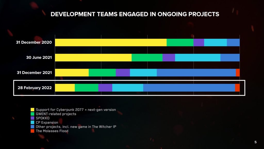 REDzi pokazali także interesującą grafikę, która rzuca nieco światła na to, co dzieje się nie tylko u nich, ale także w pozostałych studiach należących do grupy. Wiemy przecież, że The Molasses Flood pracuje nad (zapewne mniejszą) grą w uniwersum Wiedźmina albo Cyberpunka. Do tego pozostałe zespoły rozwijają istniejące już pozycje, jak choćby grupa SPOKKO. Niektórzy deweloperzy mają za zadanie pracować nad przyszłością marki Gwint, a jeszcze inni wspierają CP77 kolejnymi łatkami oraz DLC. Łącznie to dużo zadań, ale lwia część REDów skupia się przede wszystkim na Wiedźminie 4.