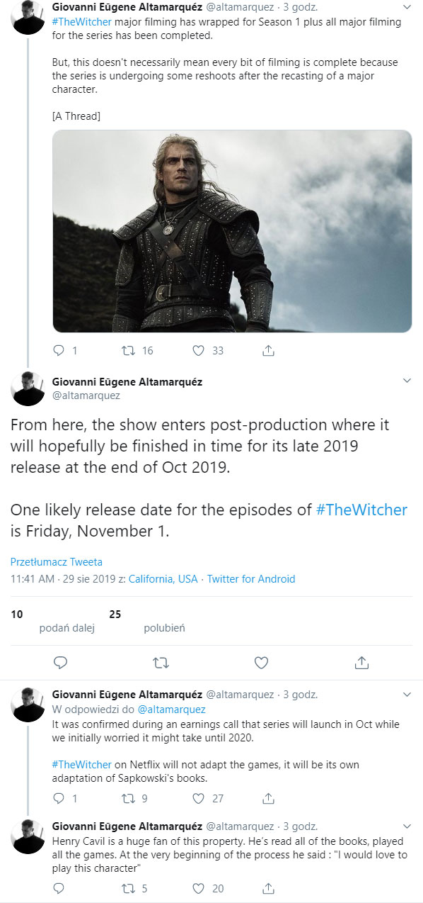 Warto dodać, Giovanni Eūgene Altamarquéz ma wypisane na swoim koncie w serwisie Twitter daty premier seriali, które ma pod swoja pieczą. W przypadku Wiedźmina producent wpisał Wiedźmin Sezon 1 – październik 19.