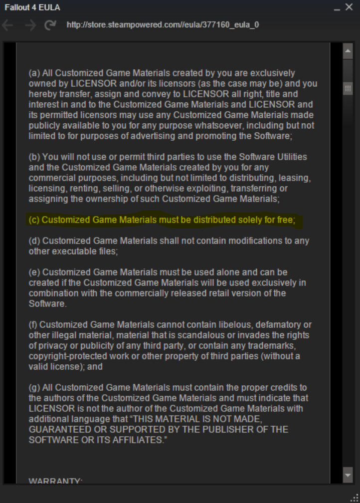 W sieci ukazała się część regulaminu licencyjnego, który dotyczy Fallout 4. Okazuje się, że wszystkie mody stworzone przez graczy, będą musiały być udostępniane za darmo. Gracze nie zarobią więc na ewentualnej własnej twórczości. Po co więc taki zapis?