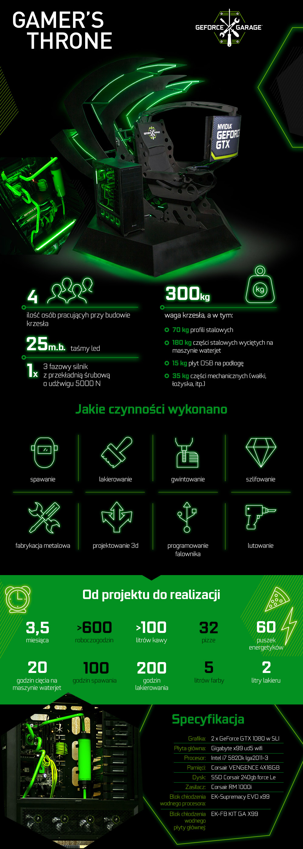 – Komputery zawsze składałem sam, nigdy nie kupowałem gotowych. Odkąd wygrałem konkurs, razem z firmą NVIDIA mogę realizować swoje najbardziej szalone pomysły – powiedział Staszek Tips Wiertelak, główny polski mechanik GeForce Garage. Staszek specjalizuje się w projektach, w których lutownica, szlifierka czy spawarka to podstawowe narzędzia pracy. Na co dzień prowadzi firmę produkującą rekwizyty i scenografie. Grami komputerowymi interesuje się od wielu lat, często uczestnicząc w ich testach przed wprowadzeniem danego tytułu na rynek. – Moim najbardziej ambitnym i wymagającym dziełem jest Gamer’s Throne. Taki projekt wymagał wielu umiejętności – projektowania i przygotowywania rysunków technicznych, modeli 3d, spawania, programowania, lutowania, malowania.